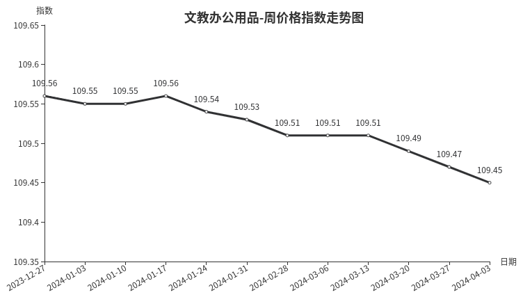 本周,文教办公用品类周价格指数收于109.45点,环比下跌0.02点,其中,文化办公用品类下跌0.03点,体育娱乐用品类价格指数与上期持平。