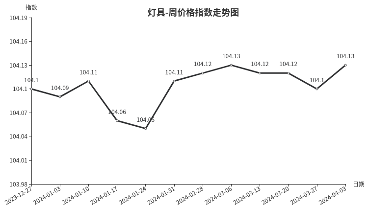 本周,灯具类周价格指数收于104.13点,环比上涨0.03点,涨幅0.03%。从盘面看,二级子类中有涨有跌,灯具配件、家居照明类分别上涨0.11、0.06点;商业照明、工艺灯及灯饰类分别下跌0.02、0.01点。