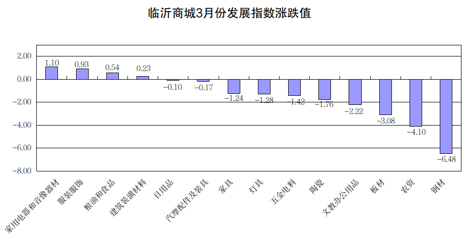 现将3月份发展指数涨跌幅较大和代表性较强的家用电器和音像器材、服装服饰、农资、钢材等市场行情作简要分析。