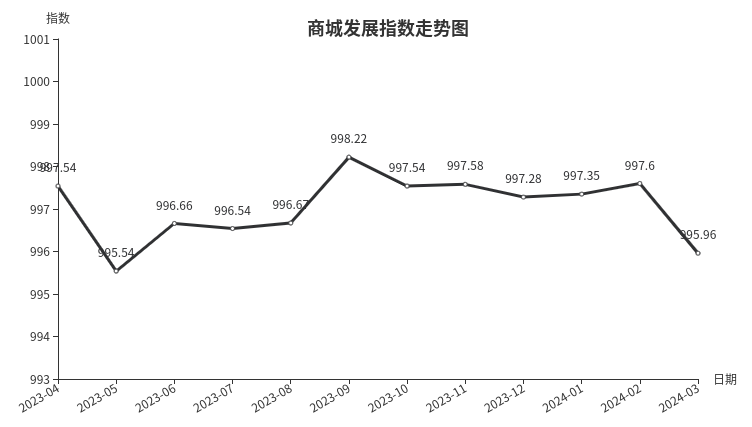 据临沂商城指数系统监测,3月份临沂商城发展指数收于995.96点,环比下跌1.63点,同比下跌2.59点。