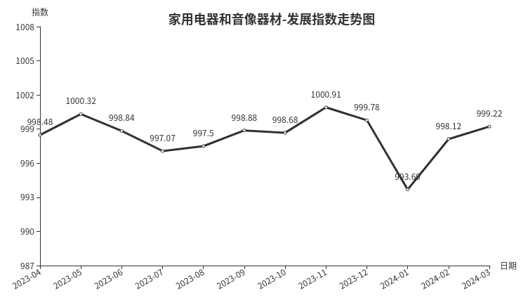 3月份,家用电器和音像器材类发展指数收于999.22点,环比上涨1.10点,同比下跌0.22点。其中,发展规模指数、发展效益指数环比分别上涨2.14、1.82点,发展信心指数环比下跌2.41点。