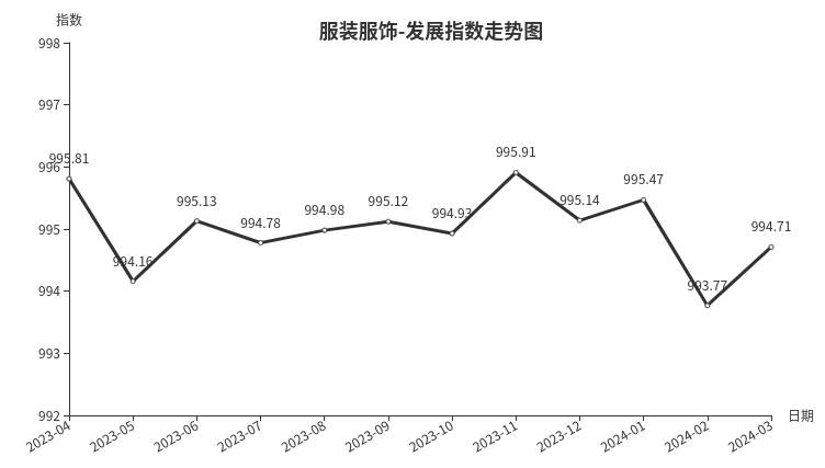 3月份,服装服饰类发展指数收于994.71点,环比上涨0.93点,同比下跌2.07点。其中,发展规模指数和发展效益指数分别环比上涨1.15点和1.53点,发展信心指数环比下跌0.67点。