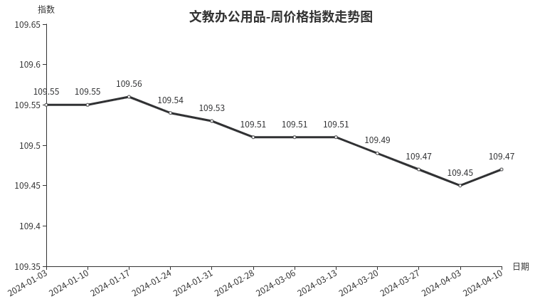 本周,文教办公用品类周价格指数收于109.47点,环比上涨0.02点。其中,文化办公用品类和体育娱乐用品类均上涨0.02点,拉动文教办公用品类周价格指数整体上涨。