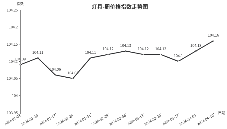 本周,灯具类周价格指数收于104.16点,环比上涨0.03点,涨幅0.03%。从盘面看,二级子类中以涨为主,户外照明、家居照明、商业照明、工艺灯及灯饰类分别上涨0.10、0.03、0.02、0.01点,灯具配件类下跌0.02点。