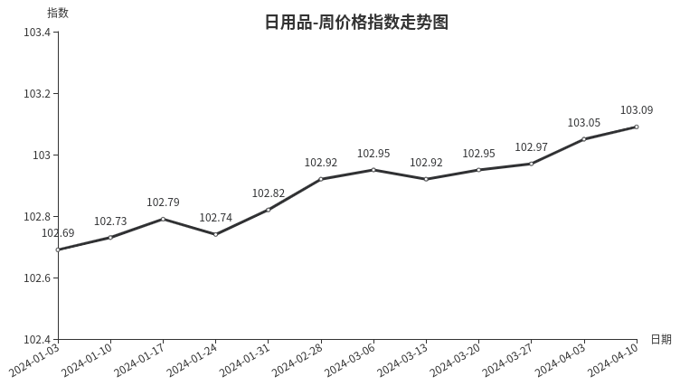 本周日用品类周价格指数继续上行,户外活动增多,下游需求释放,箱包类、护肤品类批发、零售订单增加,价格上调。清明假期期间,饰品类、玩具类行情上涨,市场客流量增加,市场进入传统旺季,价格略有上涨。从具体规格品看,阿里保罗051航空箱价格196元/个,上涨0.51%;吕九PC86-24拉杆箱价格426.43元/个,上涨2.58%;豹雪儿6606女包价格62元/个,上涨3.33%;可伶可俐120g磨砂洗面奶价格14.83元/支,上涨2.28%。
