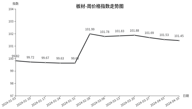 本周,板材类周价格指数收于101.45点,环比下跌0.08点,跌幅0.08%。从指数构成要素看,材料板材、周转板材周价格指数均小幅下跌,分别下跌0.09点、0.04点,跌幅分别为0.09%、0.04%。
