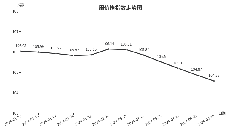 据临沂商城价格指数信息系统监测,本周临沂商城周价格总指数为104.57点,环比下跌0.30点,跌幅0.29%。