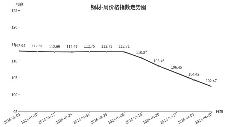 本周,钢材类周价格指数收于102.47点,环比下跌1.95点,跌幅1.87%。从盘面看,三级分类全部出现下跌,其中建筑钢材类、型材类、板材类、管材类指数分别下跌2.68点、2.63点、2.06点和1.53点。