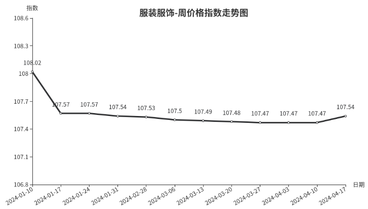 本周,服装服饰类周价格指数收于107.54点,环比上涨0.07点。从二级分类看,服装类上涨0.23点,服饰类价格指数与上期持平。