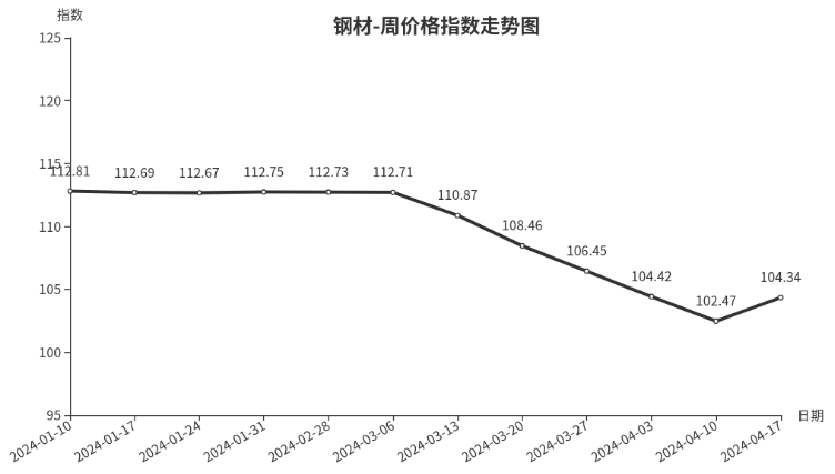 本周,钢材类周价格指数收于104.34点,环比上涨1.87点,涨幅1.82%。从盘面看,三级分类全部出现上涨,其中型材类、建筑钢材类、板材类、管材类指数分别上涨2.61点、2.58点、1.99点和1.44点。