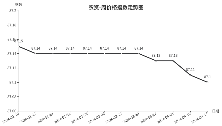 本周,农资类周价格指数收于87.10点,环比下跌0.01点。从二级分类看,农药类、种子类、养殖器具类分别下跌0.54点、0.14点和0.04点;兽禽用药类微涨0.09点;农膜类价格指数与上期持平。