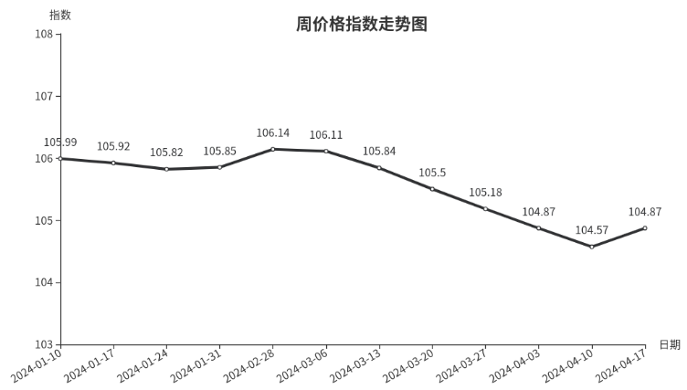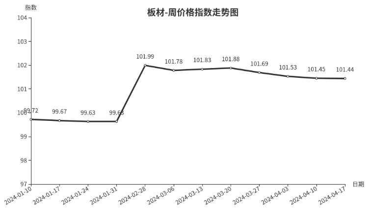 本周,板材类周价格指数收于101.44点,环比下跌0.01点,跌幅0.01%。从指数构成要素看,材料板材、周转板材周价格指数均小幅下跌,分别下跌0.01、0.02点,跌幅分别为0.01%、0.02%。