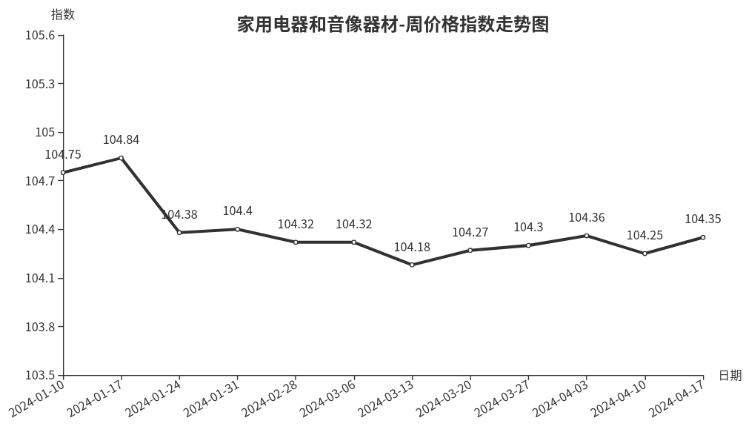 本周,家用电器和音像器材类周价格指数收于104.35点,环比上涨0.10点。二级分类中仅厨房电器震荡上涨0.43点;制冷电器、个人生活电器、净化电器、家居电器、热水器类周价格指数分别下跌0.07、0.07、0.05、0.02、0.02点。