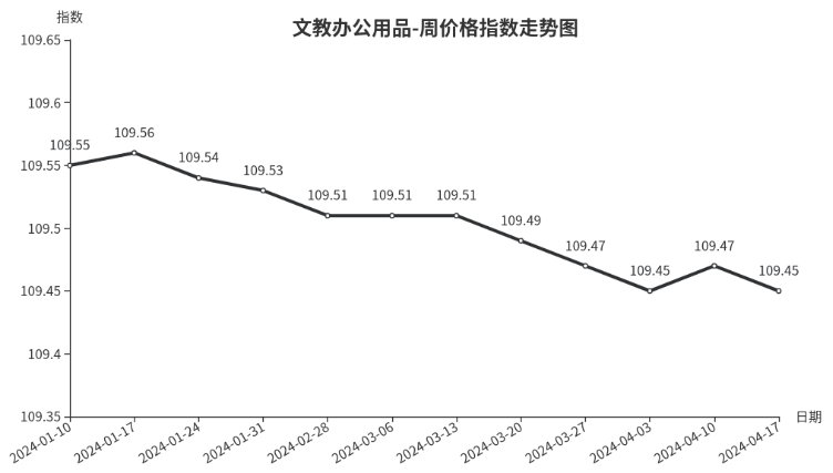 本周,文教办公用品类周价格指数收于109.45点,环比下跌0.02点,跌幅0.02%。从盘面看,二级分类全部出现下跌,文化办公用品类下跌0.02点,其中自动化设备、文教用品微幅下跌;体育娱乐用品类下跌0.02点,其中运动健身用品类出现下跌。