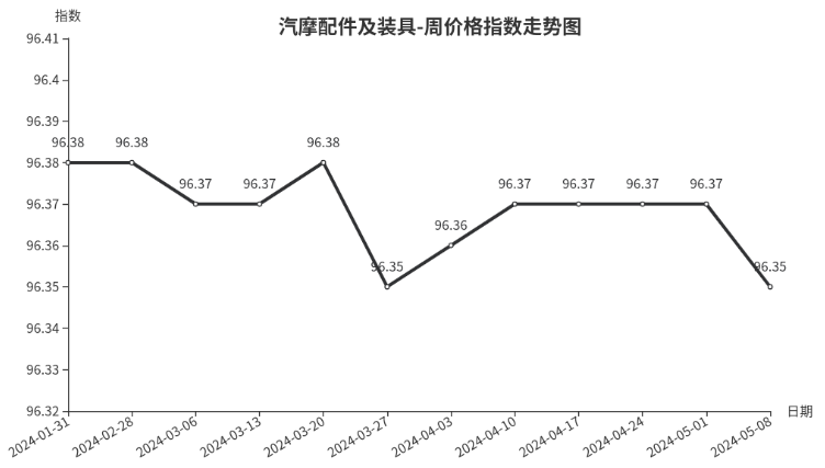 本周,汽摩配件及装具类周价格指数收于96.35点,环比下跌0.02点。二级分类中仅汽车配件下跌0.02点,主要是车身系统、底盘系统指数下跌,分别下跌0.02、0.11点;摩托车配件、装饰类商品价格较为稳定。