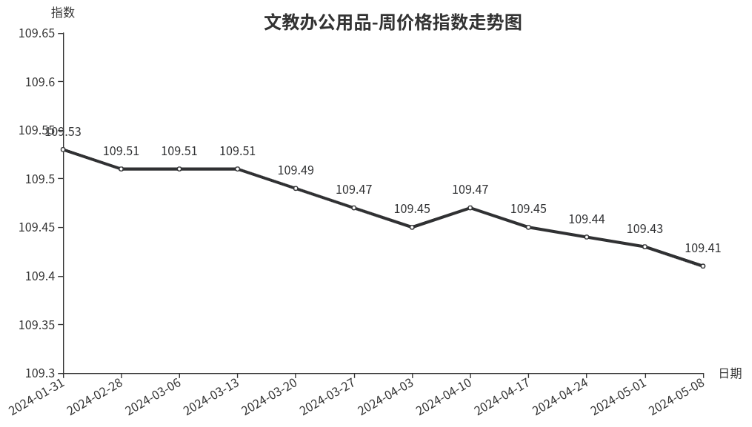 本周,文教办公用品类周价格指数收于109.41点,环比下跌0.02点。二级分类中,文化办公用品类下跌0.04点;体育娱乐用品类上涨0.01点。