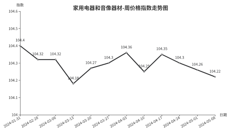 本周,家用电器和音像器材类周价格指数收于104.22点,环比下跌0.04点。其中,制冷电器类、音像器材类和个人生活用品类指数分别下跌0.34点、0.08点和0.05点,其他分类价格指数与上期持平。