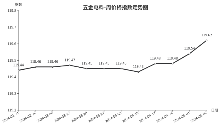 本周,五金电料类周价格指数收于119.62点,环比上涨0.08点,涨幅0.07%。从指数构成要素看,电线电缆、五金工具、建筑装饰五金周价格指数小幅上涨,涨幅分别为0.08%、0.01%、0.01%。