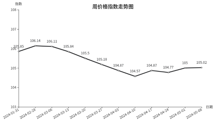 受五一假期影响,消费者外出游玩活动增加,各大旅游景点、商业装饰点缀用品使用量增加,日用工艺品、毛绒玩具、服装面料等产品需求释放,市场客流量增加,中下游经销商积极备货,销量环比涨幅明显,带动本周日用品类周价格指数小幅上行。从具体规格品看,葫芦型骨瓷青花瓶本周均价为103.75元/个,价格环比上涨3.02%;A91040礼品盒本周均价为4.12元/个,价格环比上涨2.49%;缎棉棉布本周均价为26.50元/米,价格环比上涨2.00%;相守相伴其乐融融摆件本周均价为30.83元/个,价格环比上涨1.28%。