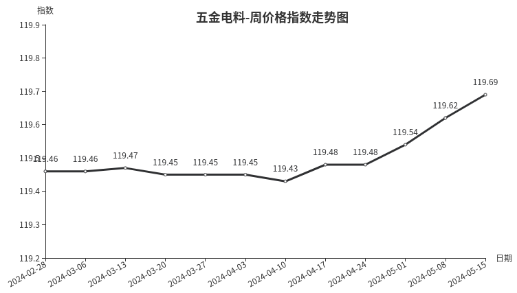 本周,五金电料类周价格指数收于119.69点,环比上涨0.07点,涨幅0.06%。从指数构成要素看,电线电缆、电工电器指数小幅上涨,涨幅分别为0.99%、0.03%,其它分类价格指数微跌或者持平。