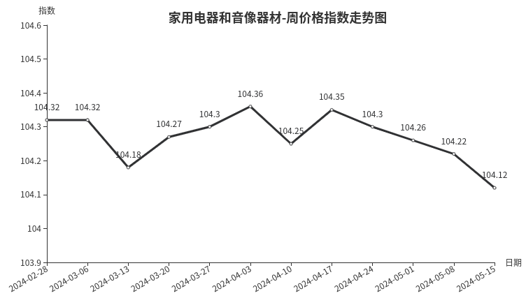 本周,家用电器和音像器材类周价格指数收于104.12点,环比下跌0.10点,跌幅0.10%。从盘面看,制冷电器类、厨房电器类指数下跌明显,指数分别下跌0.52点和0.20点。