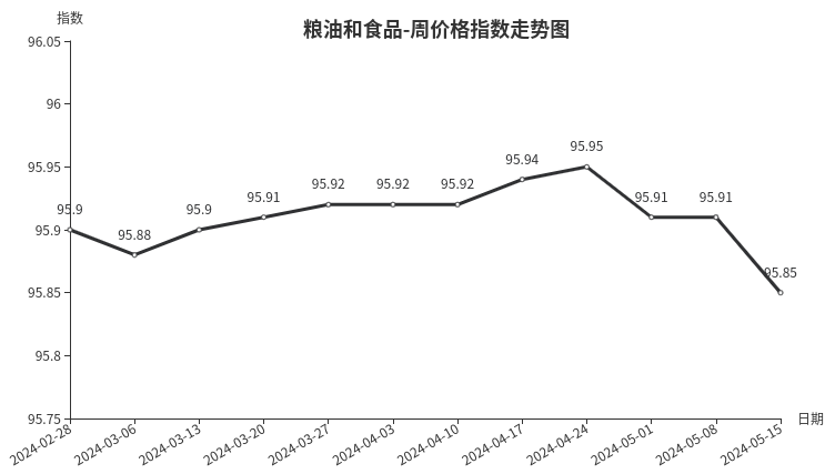 本周,粮油和食品类周价格指数收于95.85点,环比下跌0.06点,跌幅0.06%。从盘面看,粮油类下跌0.09点,调味品类、茶叶类和干果类分别上涨0.18点、0.11点和0.02点,副食类价格与上期持平。