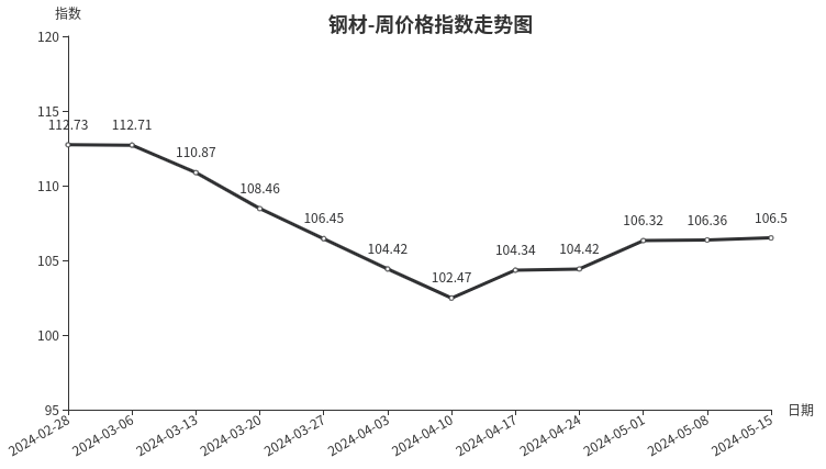 本周,钢材类周价格指数收于106.50点,环比上涨0.14点,涨幅0.13%。从盘面看,三级分类全部上涨,其中建筑钢材类、型材类、板材类、管材类指数分别上涨0.27点、0.21点、0.12点和0.10点。