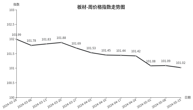 本周,板材类周价格指数收于101.02点,环比下跌0.07点,跌幅0.07%。从指数构成要素看,材料板材、周转板材指数均小幅下跌,分别下跌0.02点、0.32点,跌幅分别为0.02%、0.31%。