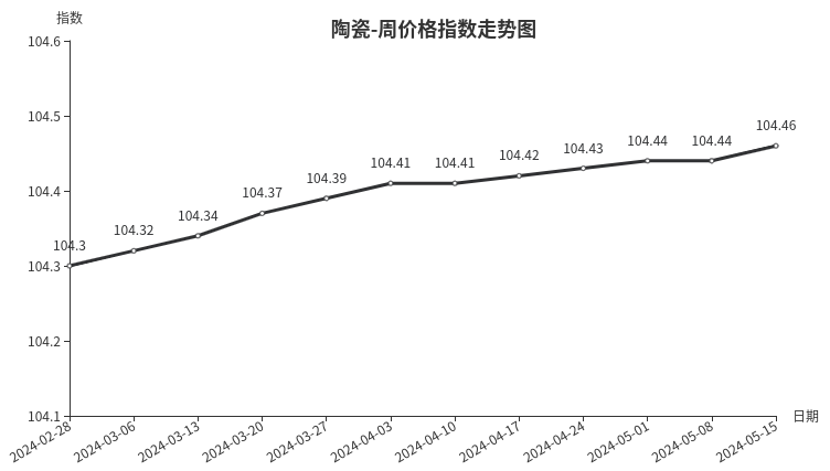 本周,陶瓷类周价格指数收于104.46点,环比上涨0.02点,涨幅0.02%。从指数构成要素看,建筑陶瓷指数小幅上涨,上涨0.03点,涨幅0.03%;陶瓷洁具、日用陶瓷指数环比持平。