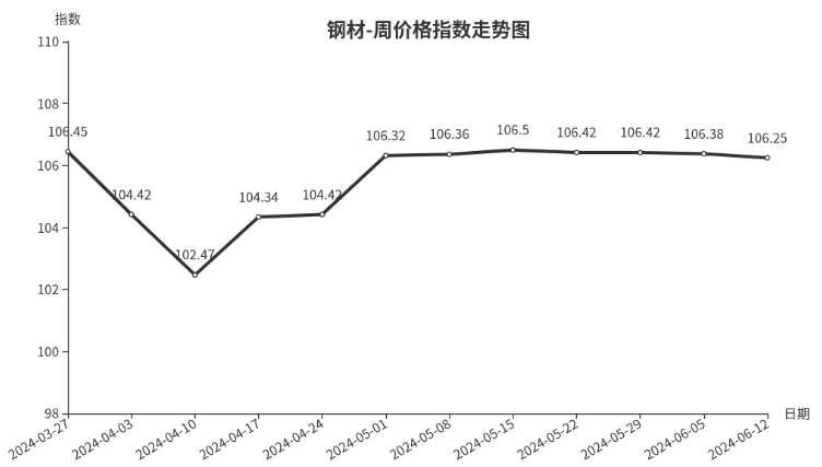 本周,钢材类周价格指数收于106.25点,环比下跌0.13点,跌幅0.12%。从盘面看,三级分类全部下跌,其中型材类、管材类、建筑钢材类、板材类指数分别下跌0.17点、0.13点、0.11点和0.03点。
