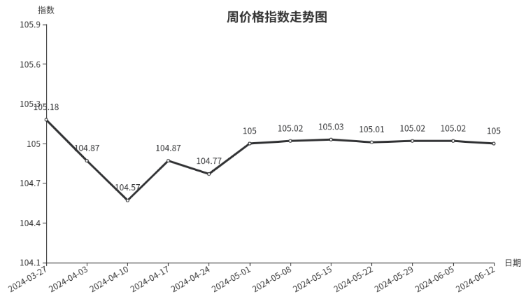 本周钢材类周价格指数继续下跌。市场进入传统淡季,需求进一步缩减,铁矿石等原材料价格下降,期货市场下行,部分钢厂下调钢材价格,市场钢材价格随之下跌。同时,六月份恰逢农忙季节,市场车流量偏少,市场整体交易清淡。从具体规格品看,HRB400 8mm价格3749元/吨,下跌2.12%;10mm槽钢价格3565元/吨,下跌1.15%;镀锌40*60mm方管价格4069元/吨,下跌0.74%;镀锌25mm圆管价格4410元/吨,下跌0.72%;直径35mm热轧圆钢价格4038元/吨,下跌0.15%;