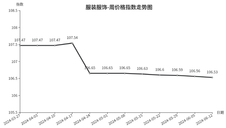 本周,服装服饰类周价格指数收于106.53点,环比下跌0.03点。从二级分类看,服饰类下跌0.03点,服装类下跌0.01点。