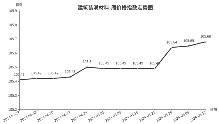 本周,建筑装潢材料类周价格指数收于105.68点,环比上涨0.03点,涨幅0.03%。从盘面看,二级分类中装饰材料类上涨0.04点,拉涨整体指数;结构安装材料类、专用材料类环比下跌,指数分别下跌0.15点和0.06点;结构材料类指数与上周持平。