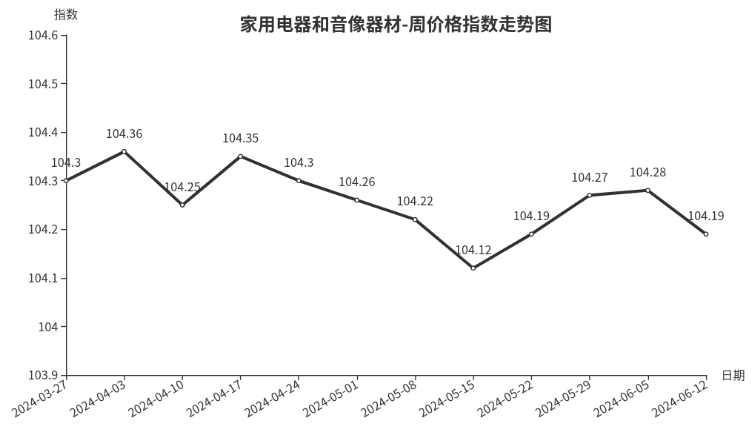 本周,家用电器和音像器材类周价格指数收于104.19点,环比下跌0.09点,跌幅0.09%。从盘面看,厨房电器、制冷电器、个人生活电器、音像器材、电风扇、家居电器类分别下跌0.22、0.16、0.08、0.05、0.04、0.02点;热水器、净化电器类分别上涨0.10、0.05点。