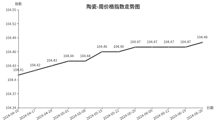 本周,陶瓷类周价格指数收于104.48点,环比上涨0.01点,涨幅0.01%。从指数构成要素看,陶瓷洁具、建筑陶瓷、日用陶瓷周价格指数均上涨0.01点。