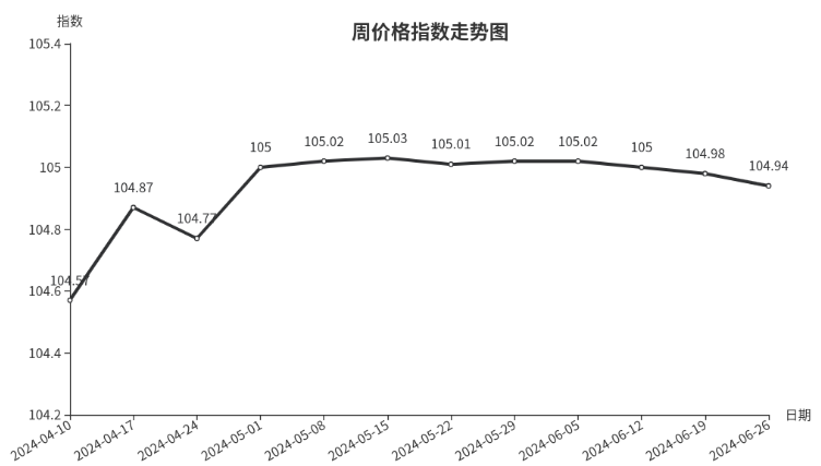 据临沂商城价格指数信息系统监测,本周临沂商城周价格总指数为104.94点,环比下跌0.04点,跌幅0.04%。
