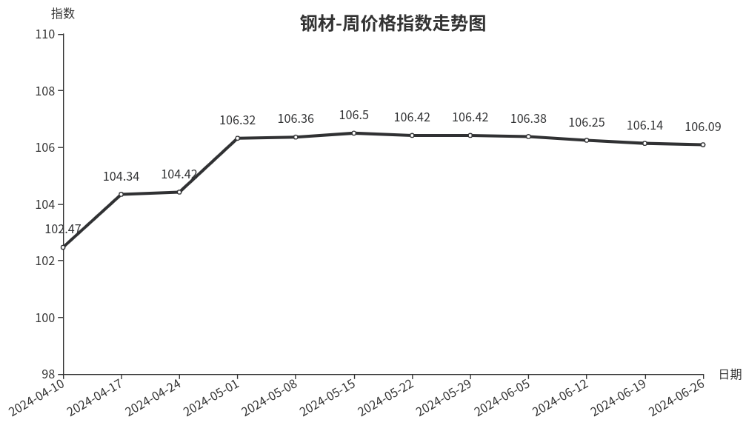 本周,钢材类周价格指数收于106.09点,环比下跌0.05点,跌幅0.05%。从盘面看,三级分类全部下跌,其中型材类、板材类、建筑钢材类、管材类指数分别下跌0.19点、0.14点、0.06点和0.02点。