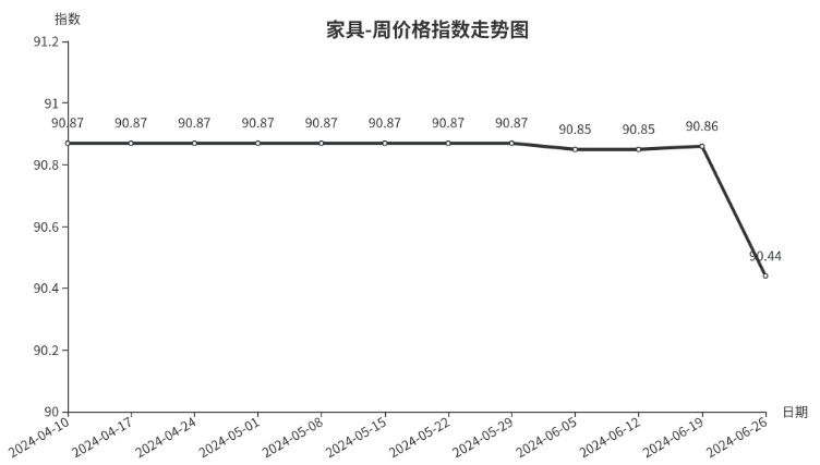 本周,家具类周价格指数收于90.44点,环比下跌0.42点,跌幅0.46%。从盘面看,二级分类中架类、坐具类、柜类、床及用品类指数均出现下跌,拉动整体指数下行,只有桌类指数出现微幅上涨。