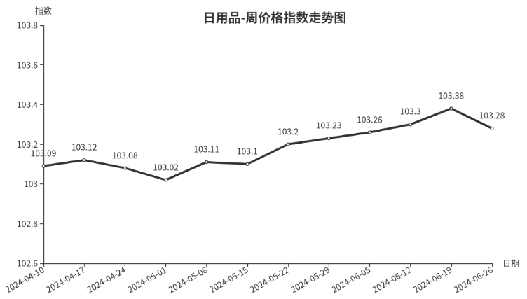 本周日用品类周价格指数小幅下跌。受近期持续高温天气和暑期临近影响,护肤品、美术工艺品、首饰等产品市场需求增加,部分产品销售价格小幅下调,中下游经销商积极备货,当前市场销售主要以批发为主,拉动平均销售价格小幅下降。从具体规格品看,水滴眼风铃(大)本周均价为20.00元/个,价格环比下降4.12%;50cm地球仪本周均价为612.50元/个,价格环比下降3.81%;名蔻卸妆液本周均价为4.92元/盒,价格环比下降3.15%;卡丽欧塑料发箍本周均价为3.03元/盒,价格环比下降2.57%。