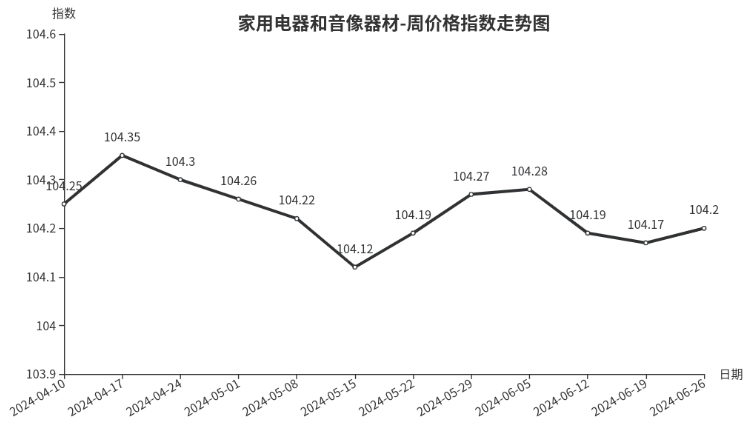 本周,家用电器和音像器材类周价格指数收于104.20点,环比上涨0.03点,涨幅0.03%。从指数构成要素看,净化电器、制冷电器、电风扇、家居电器分别上涨0.87点、0.10点、0.06点、0.03点;厨房电器、音像器材、个人生活电器、热水器分别下跌0.06点、0.05点、0.02点、0.01点。