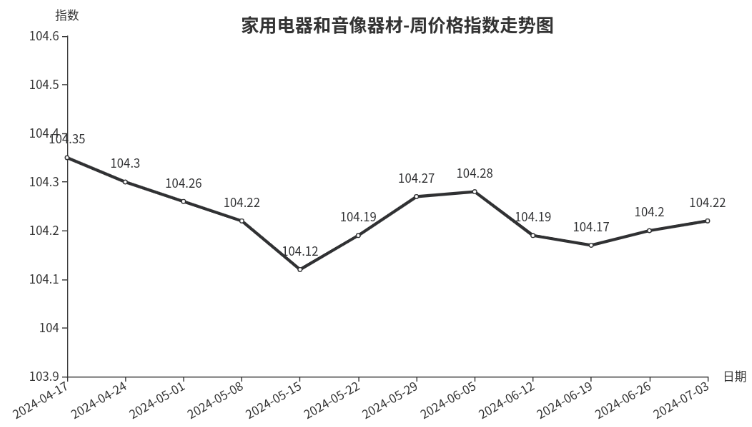 本周,家用电器和音像器材类周价格指数收于104.22点,环比上涨0.02点,涨幅0.02%。从指数构成要素看,制冷电器、厨房电器领涨,分别上涨0.30、0.10点,音像器材微涨0.01点;净化电器、个人生活电器分别下跌0.65、0.10点。
