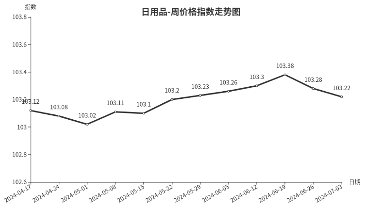 本周,日用品类周价格指数收于103.22点,环比下跌0.06点,跌幅0.06%。从盘面看,二级分类中,工艺品类、护理及美容用品类、首饰类指数分别下跌0.49点、0.37点和0.33点,成为拉动指数下跌的主要因素;箱包类、玩具类、辅料和包装类则分别上涨0.67点、0.05点和0.01点。