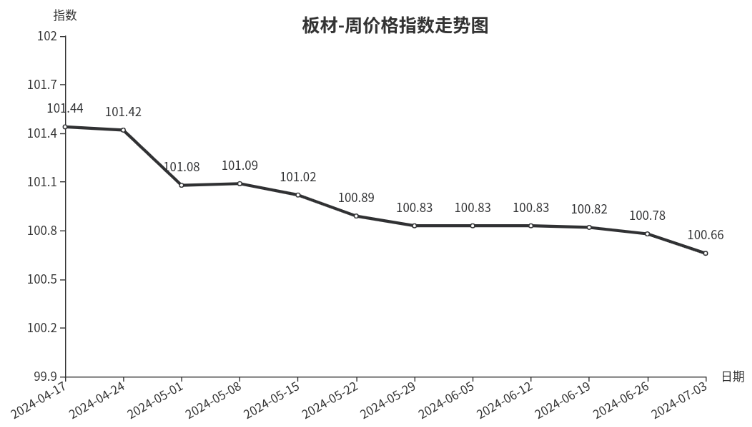 本周,板材类周价格指数收于100.66点,环比下跌0.12点,跌幅0.12%。从指数构成要素看,材料板材、周转板材周价格指数均小幅下跌,分别下跌0.14%、0.04%。
