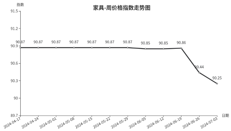 本周,家具类周价格指数收于90.25点,环比下跌0.19点,跌幅0.21%。从盘面看,二级分类除架类价格不变,其他分类全部下跌,是导致周价格指数下跌的主要原因。