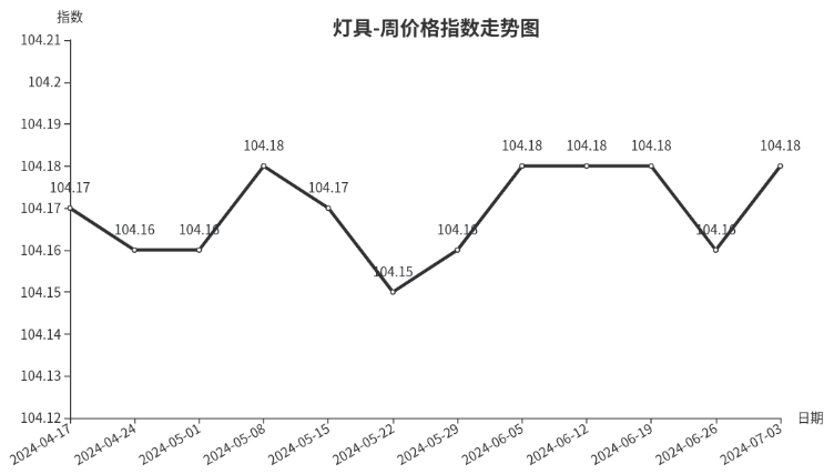 本周,灯具类周价格指数收于104.18点,环比上涨0.02点,涨幅0.02%。从指数构成要素看,灯具配件类、家居照明类分别上涨0.10点、0.01点;商业照明类、户外照明类、工艺灯及灯饰类与上周持平。