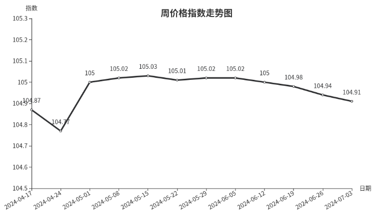 据临沂商城价格指数信息系统监测,本周临沂商城周价格总指数为104.91点,环比下跌0.03点,跌幅0.03%。