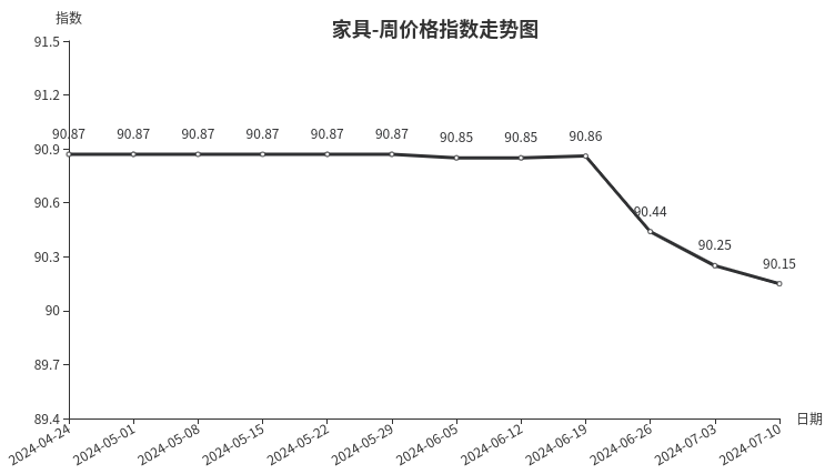 本周,家具类周价格指数收于90.15点,环比下跌0.10点,跌幅0.11%。从盘面看,二级分类中桌类和床及用品类指数均出现下跌,分别下跌0.28点和0.26点,其他指数均与上周持平。