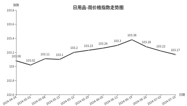 本周日用品类周价格指数继续小幅下跌。近期降雨较为频繁,高温天气有所缓解,外加暑期到来,外出游玩人员增加,箱包、护肤品、首饰等产品市场需求增加,中下游经销商积极备货,销售额环比上涨,且市场销售中主要以集中采购为主,拉动部分产品平均销售价格小幅下降。从具体规格品看,朵S-009书包本周均价为240.00元/个,价格环比下降4.00%;芭保丽5g护唇膏本周均价为2.90元/瓶,价格环比下降3.97%;名蔻120g眼霜本周均价为15.10元/支,价格环比下降2.96%;艺琳塑料发簪本周均价为3.00元/个,价格环比下降2.28%。