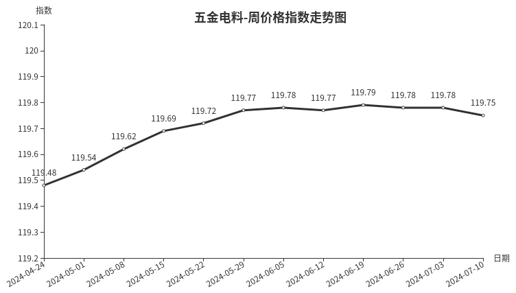 本周,五金电料类周价格指数收于119.75点,环比下跌0.03点,跌幅0.03%。从盘面看,二级分类中,电线电缆、电工电器、焊机焊具和焊材、五金工具类价格指数分别下跌0.25、0.02、0.01、0.01点;安防设备与用品、建筑装饰五金类分别上涨0.05、0.02点。