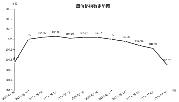 据临沂商城价格指数信息系统监测,本周临沂商城周价格总指数为104.75点,环比下跌0.16点,跌幅0.16%。